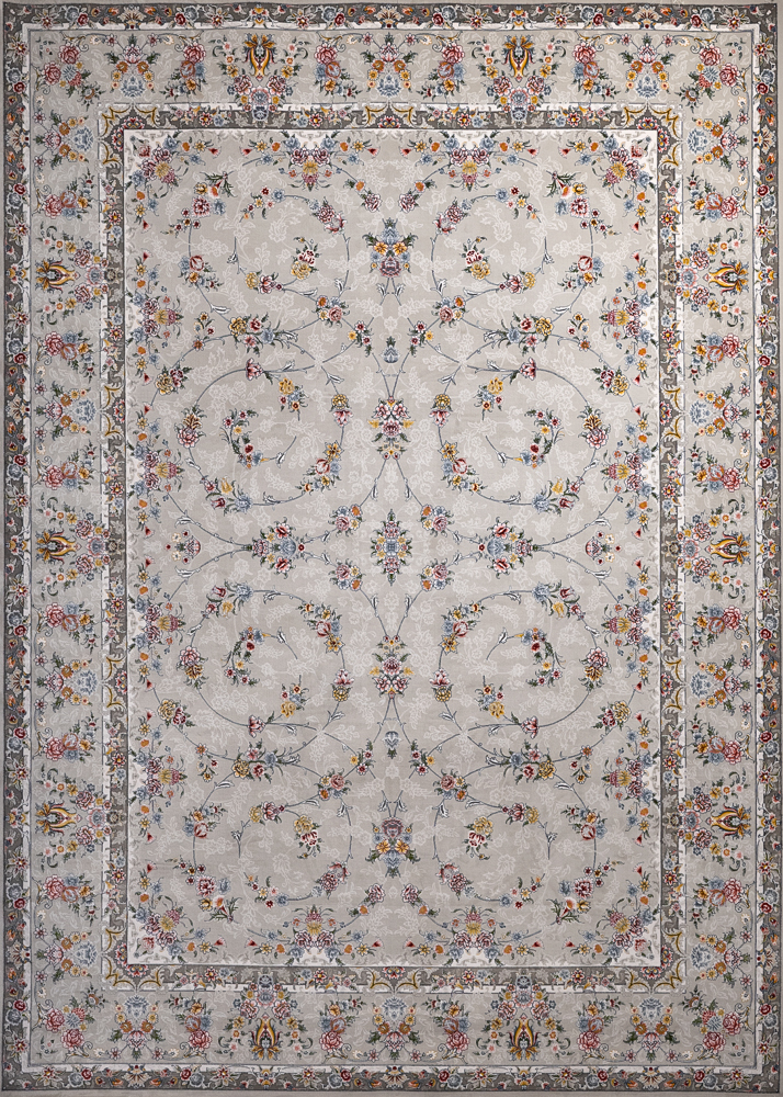 به لطف زمینه روشن صدفی، این فرش به‌خوبی با مبلمان مینیمال در رنگ‌های خاکستری، سفید و طوسی ترکیب می‌شود. استفاده از کوسن‌هایی با رنگ‌های آبی یا صورتی کهنه (مشابه رنگ‌های گل‌های فرش) می‌تواند پل رنگی زیبایی بین فرش و مبلمان ایجاد کند. یک میز جلو مبلی شیشه‌ای یا فلزی مدرن نیز تضاد جذابی با نقشه سنتی فرش خلق خواهد کرد و فضایی به سبک ترنزیشنال (ترکیب مدرن و کلاسیک) به ارمغان می‌آورد.