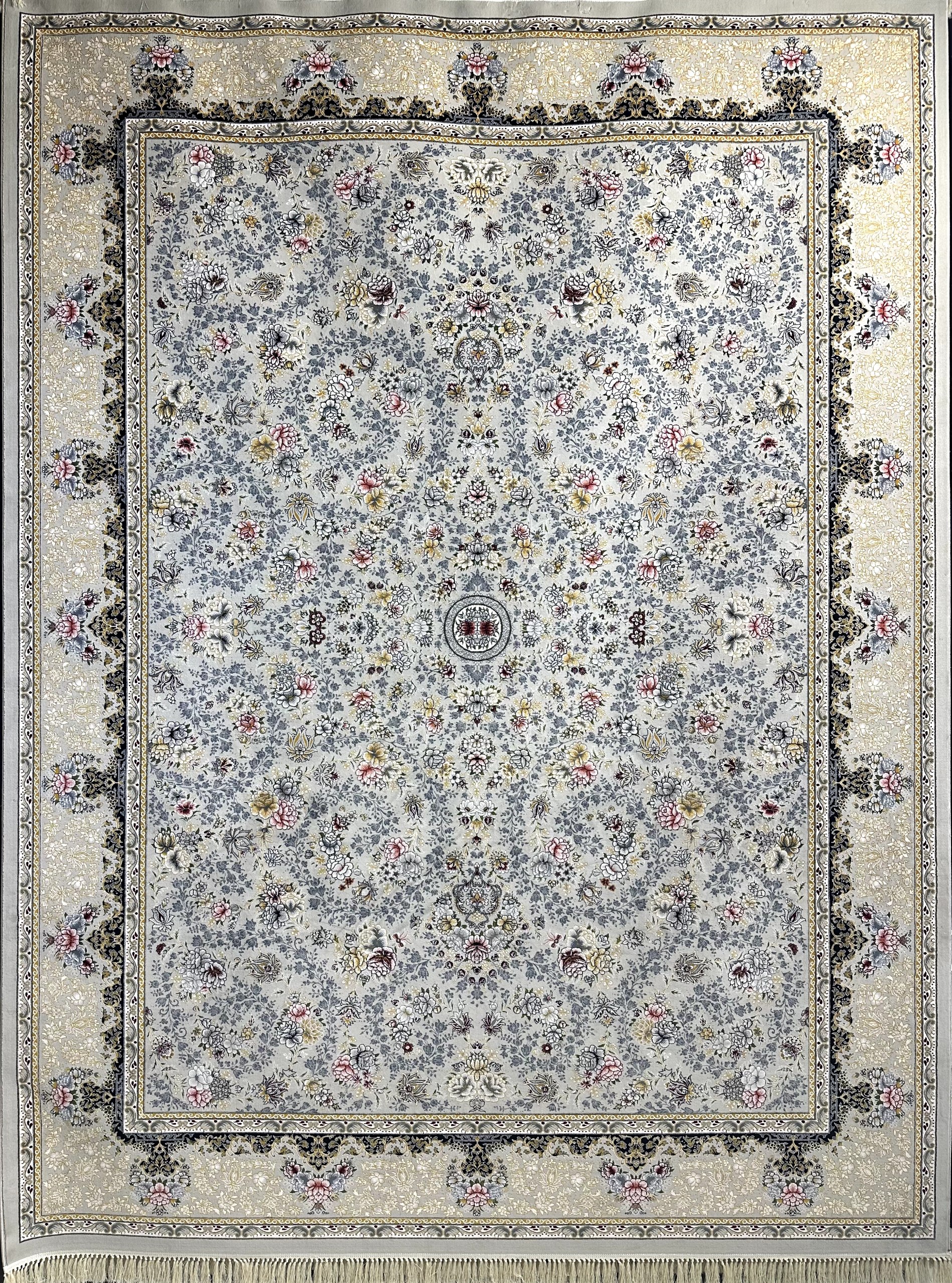 رنگبندی صدفی این فرش، ترکیبی ملایم و چشمنواز از تُنهای نقرهای، خاکستری روشن و سفید مرواریدی است که با گلهای رنگارنگ صورتی، گلبهی، طلایی، آبی و سبز زیتونی تلفیق شده و جلوهای مجلل و در عین حال آرامشبخش ایجاد کرده است. حاشیه فرش با طرحهای اسلیمی و لچکترنجهای تیره در زمینه بژ طلایی، قاببندی باشکوهی را برای متن فرش فراهم آورده است.