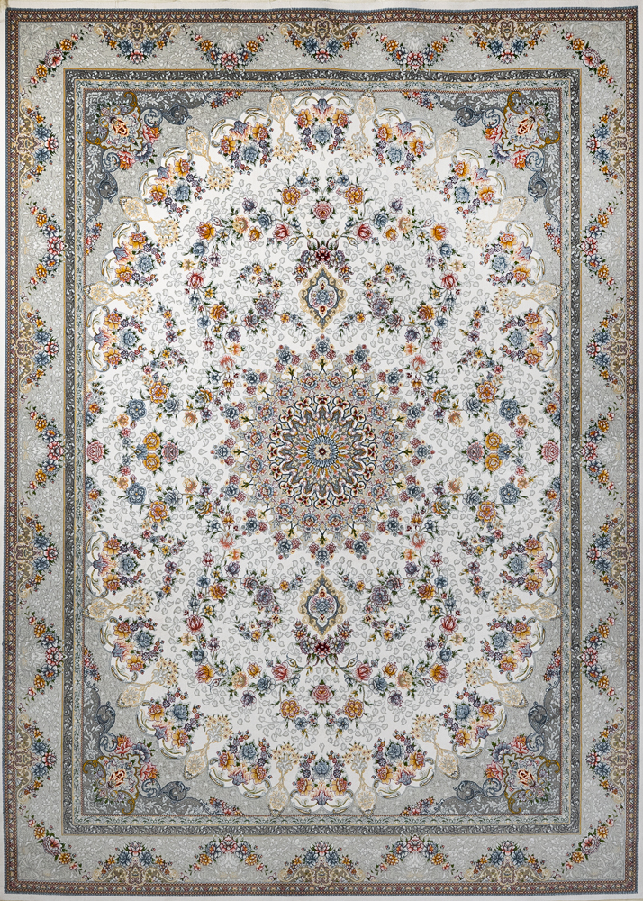 رنگ صدفی (Oyster / Pearl Ivory) یکی از محبوب‌ترین و پرتقاضاترین رنگ‌ها در بازار فرش ایران و جهان است. زمینه کرم مرواریدی این فرش، نوری ملایم و گرم را به فضای اتاق منعکس می‌کند و حس وسعت و آرامش را در محیط تقویت می‌نماید. ترکیب این زمینه روشن با نقوش رنگارنگ گل‌های آبی، صورتی، نارنجی، طلایی و سبز، تضاد رنگی ظریف و هنرمندانه‌ای را ایجاد کرده که هم جذابیت بصری بالایی دارد و هم با طیف وسیعی از سبک‌های دکوراسیون داخلی سازگار است.