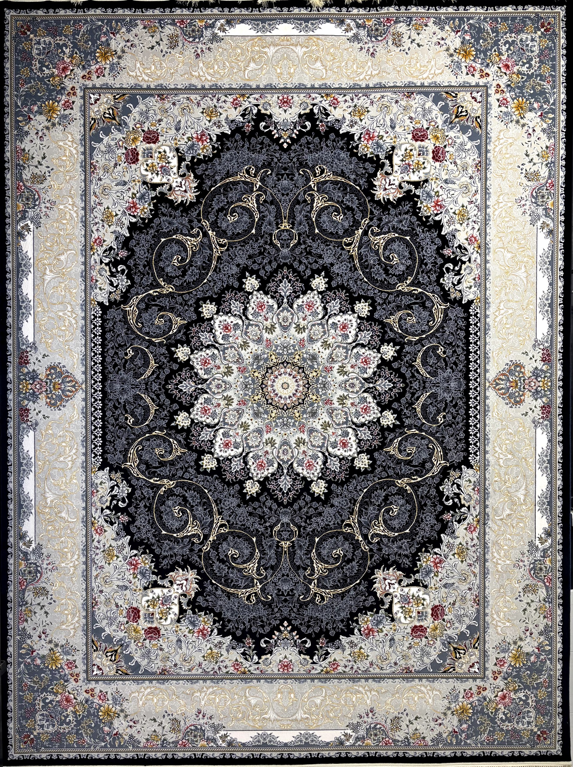 رنگ صدفی این فرش، ترکیبی نجیب و ملایم از خاکستری نقره‌ای روشن با ته‌رنگ مرواریدی است که فضایی آرام، مدرن و در عین حال باشکوه می‌آفریند. در بطن این زمینه صدفی، رگه‌هایی از طلایی کم‌رنگ در قوس‌ها و اسلیمی‌ها دیده می‌شود که گرمای ظریفی به کلیت اثر بخشیده است. لمس‌هایی از رنگ‌های گلبهی، جگری، زرشکی ملایم و سبز خاموش در گل‌ها و بوته‌های پراکنده، تنوع رنگی سنجیده و هنرمندانه‌ای را رقم زده‌اند. حاشیه اصلی فرش با تُنالیته خاکستری تیره‌تر، کنتراست زیبایی با متن روشن‌تر ایجاد کرده و به تعریف و قاب‌بندی نقشه کمک می‌کند. مجموع این پالت رنگی، فرشی خلق کرده که هم در دکوراسیون‌های کلاسیک و هم در چیدمان‌های مدرن و معاصر، حضوری تأثیرگذار و به‌یادماندنی دارد.