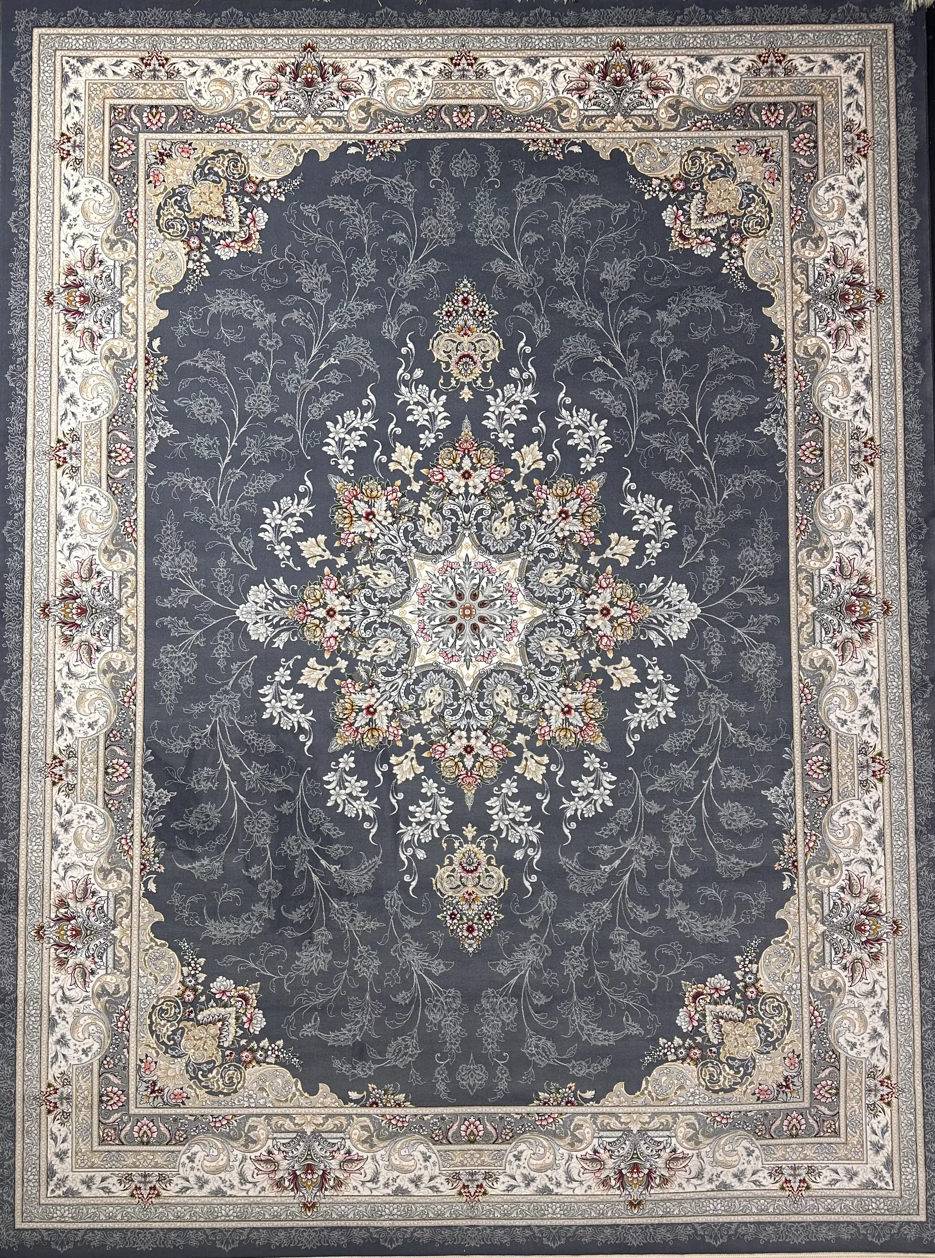 چهار لچک فرش نیز با همان دقت و ظرافت طراحی شدهاند و با حاشیههای تو در تو و پرکار، قاببندی بینظیری را برای متن فرش ایجاد کردهاند. زمینه دودی فرش، بستری مناسب برای درخشش گلهای رنگی و نقوش ظریف فراهم کرده و جلوهای اشرافی و در عین حال دلنشین به محصول بخشیده است.